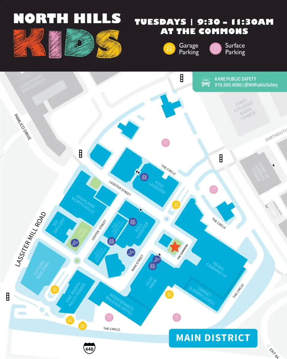 Parking is free in both the underground parking garage and on street level. To access the parking garage from Six Forks Road, stay in the inside lane and continue down the ramp. Once inside, use the elevators or escalators to reach street level.