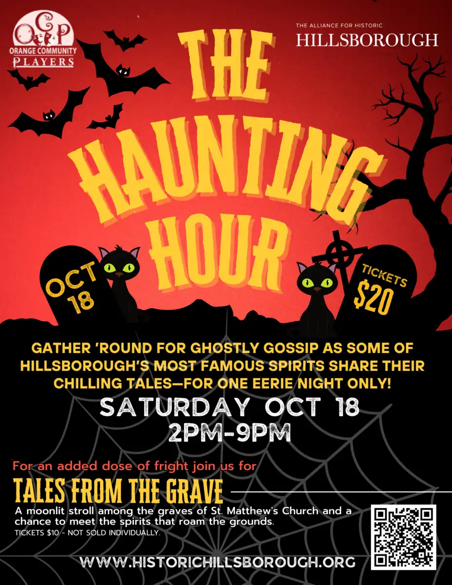 Step into the shadows of Hillsborough’s past at The Haunting Hour, our brand-new take on the dearly departed Spirits Tours! We’ve buried the old format, now join us for an immersive evening of storytelling, where ghostly tales and eerie legends unfold around you in a spine-tingling performance at the historic Hughes Academy. A partnership between the Alliance for Historic Hillsborough and the Orange Community Players. With haunting histories brought to life before your eyes, every twist and turn will keep you on edge.
