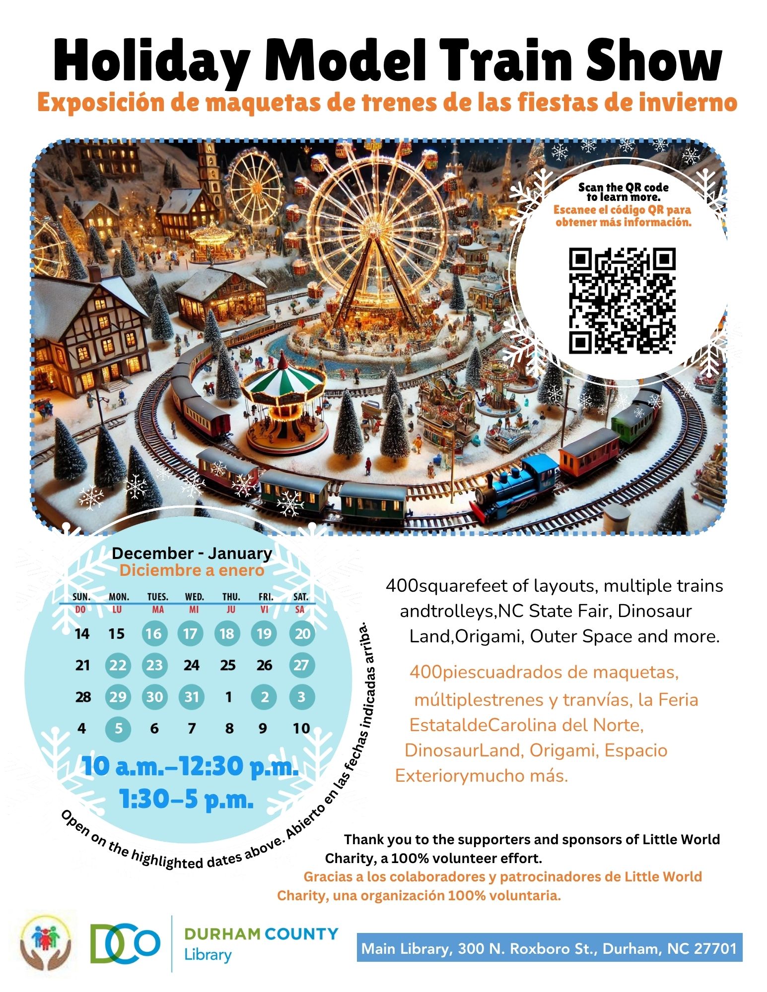 Durham County Main Library 300 N Roxboro St., Durham, NC*EXHIBIT CLOSES 12:30pm-1:30pm* All aboard and welcome to the train show! This exhibit is brought to us by Little WORLD ...