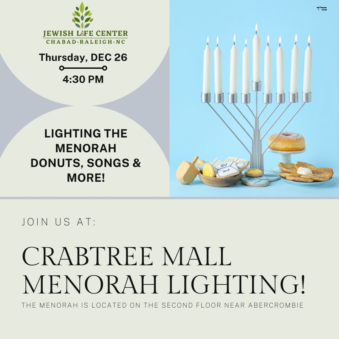 Lighting the menorah, donuts, songs, & more! The menorah is located on the second floor near Abercrombie. This is a ...