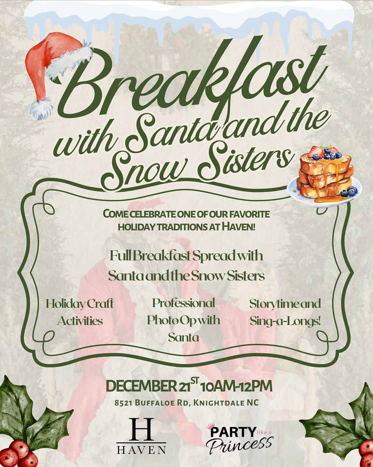 Haven Farm 8521 Buffaloe Road, Knightdale, NCBreakfast with Santa and the Snow Sisters Sunday 12/21 10am-12pm with @partylikeaprincessllc Tickets range from $35-50. Kids 2 and under ...