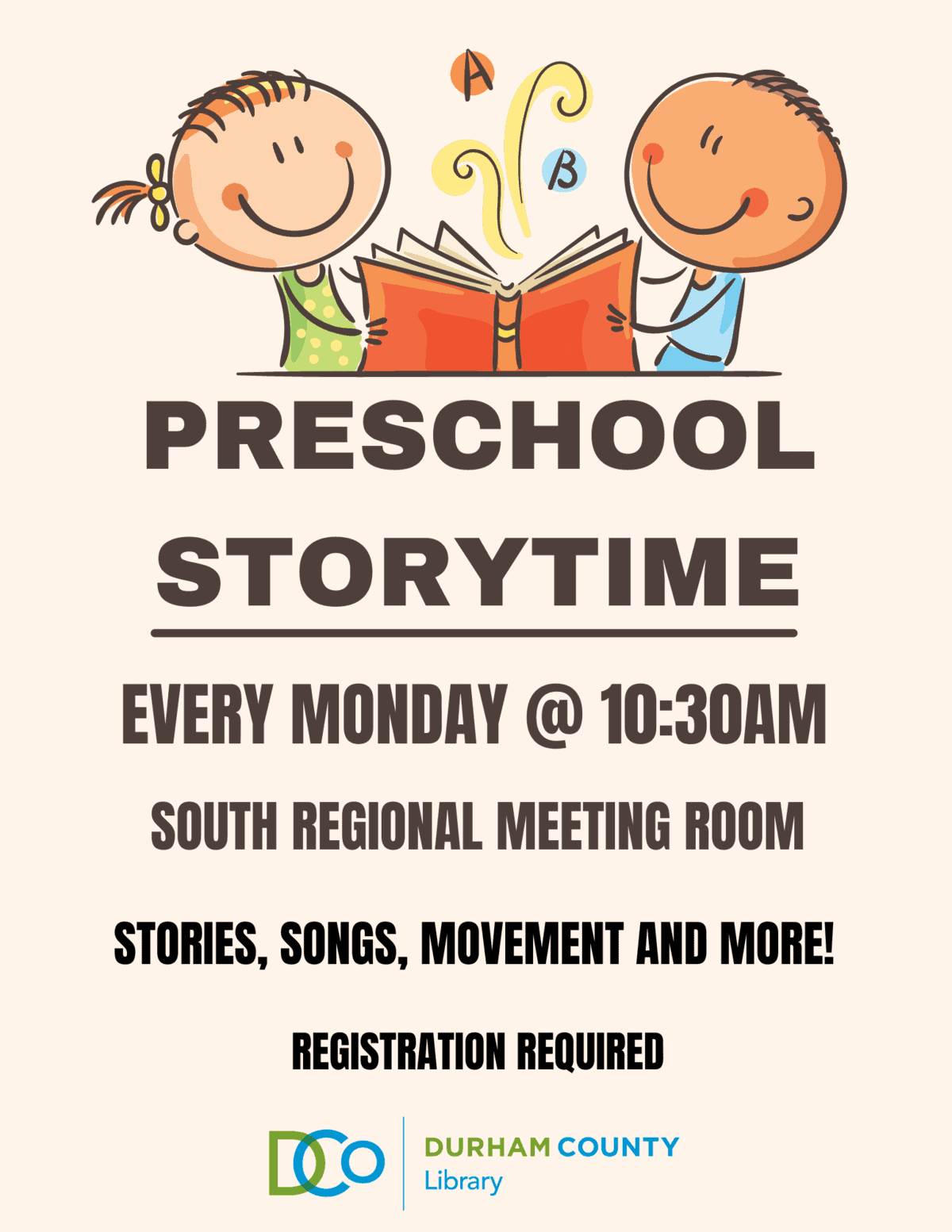 Monday storytime with stories, songs, movement, and more. Participation encouraged. Registration required.