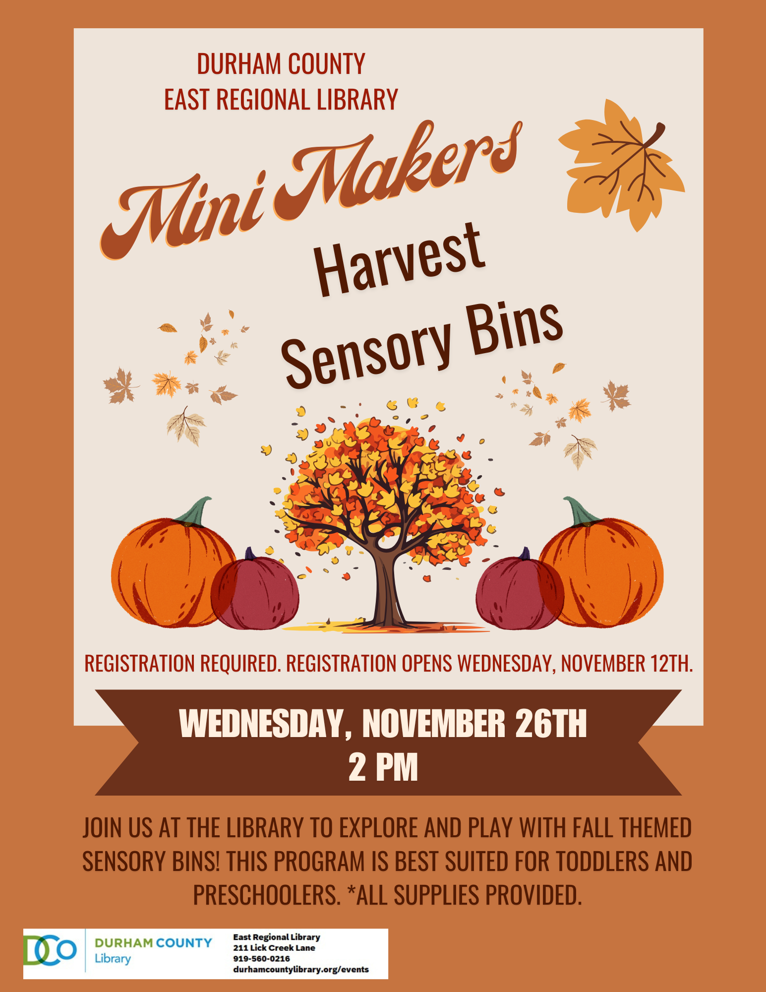 Join us at the library to explore and play with fall themed sensory bins! This program is best suited for ...
