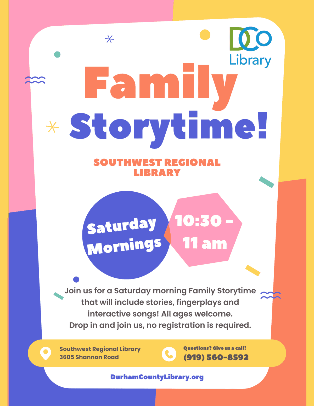 Interactive family storytime with stories, songs, and fingerplays. Intended for ages 0–5.