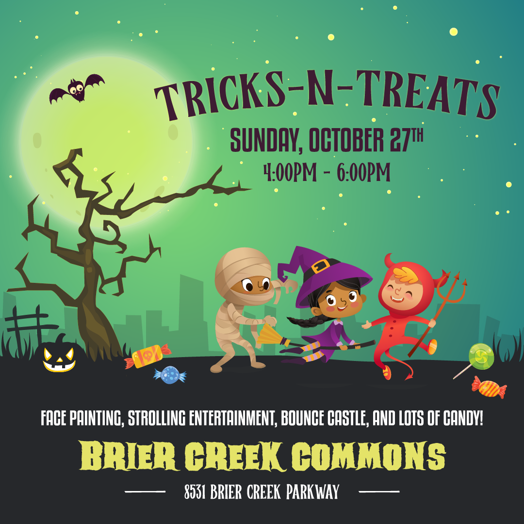 Join us for the first-ever Tricks-N-Treats in Brier Creek Commons. Grab your favorite Halloween costume and come out for free ...